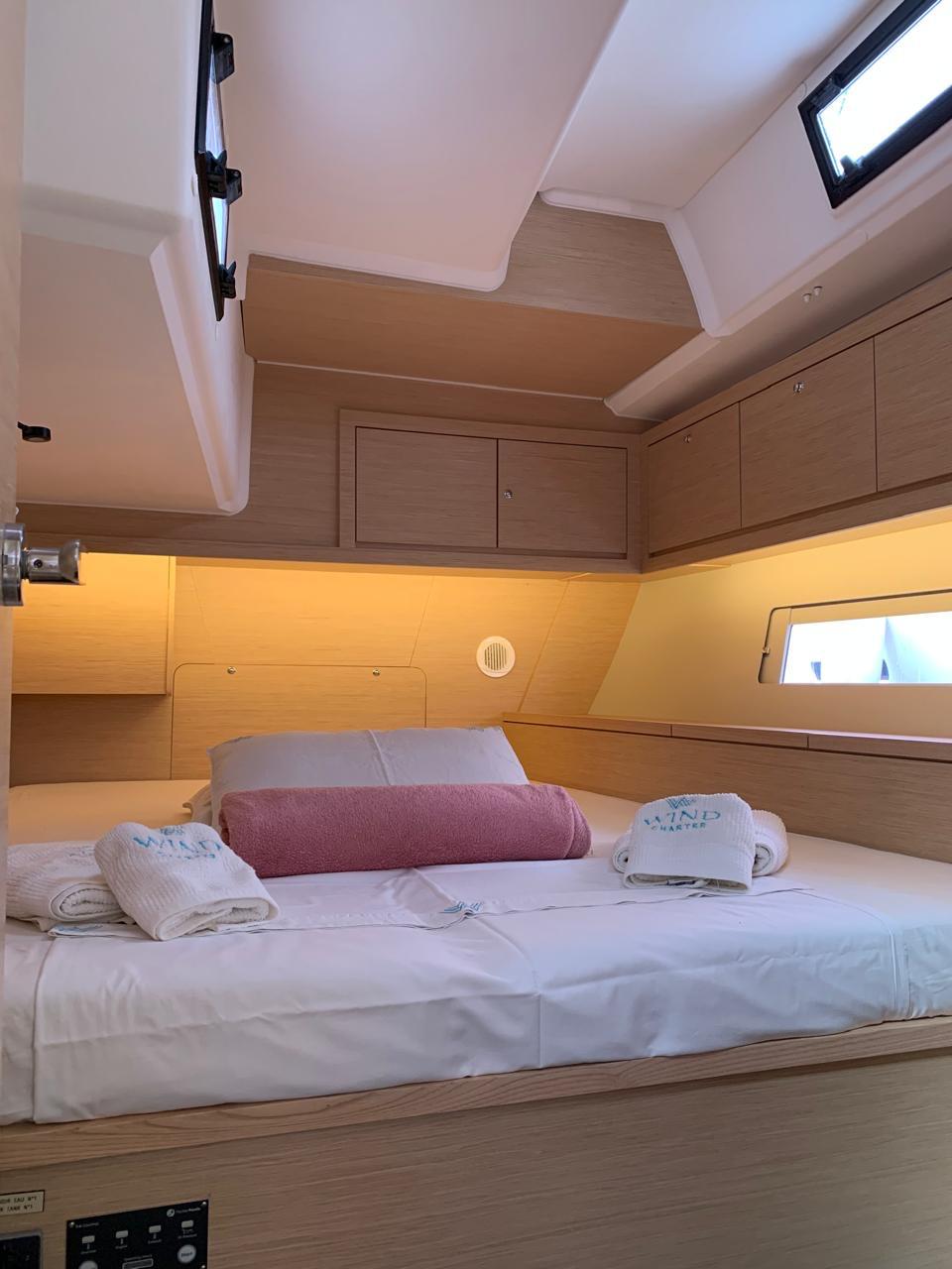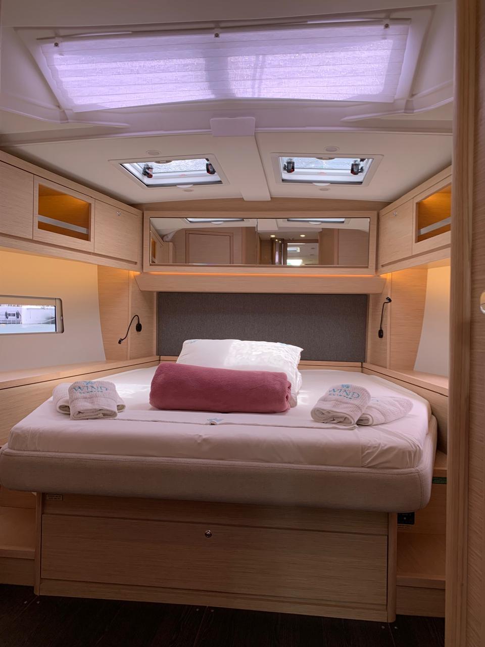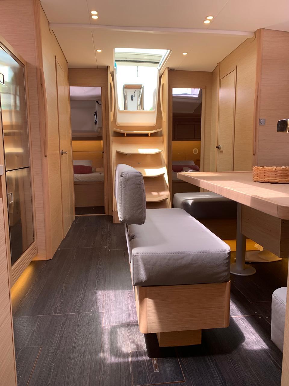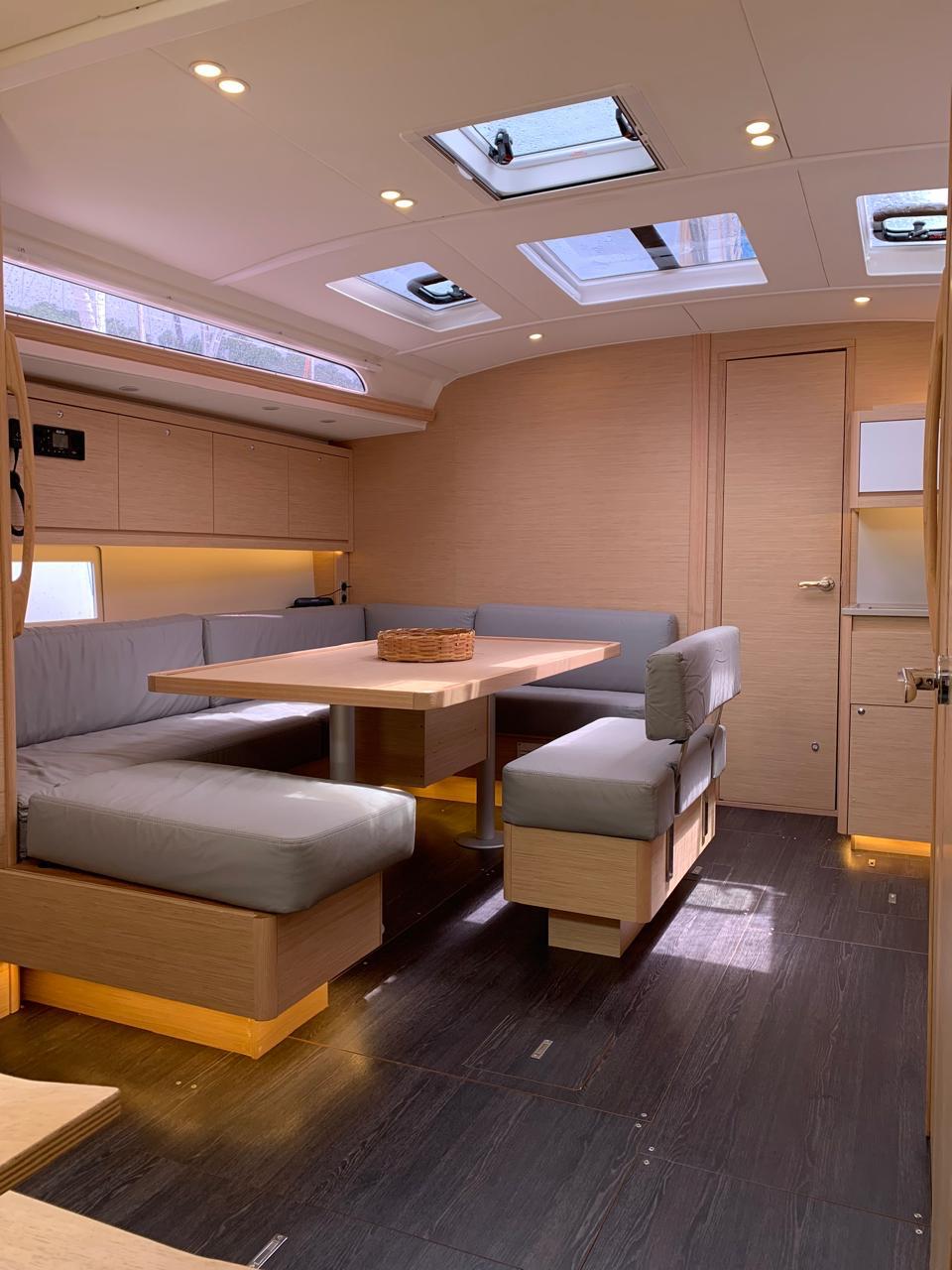 La distribución del Dufour 470 permite alojar a una tripulación de hasta 8 adultos + patrón, cómodamente alojados en 3 camarotes interiores y un camarote abatible (cabina lateral con dos literas individuales), además del tradicional y esencial camarote exterior para el patrón.
