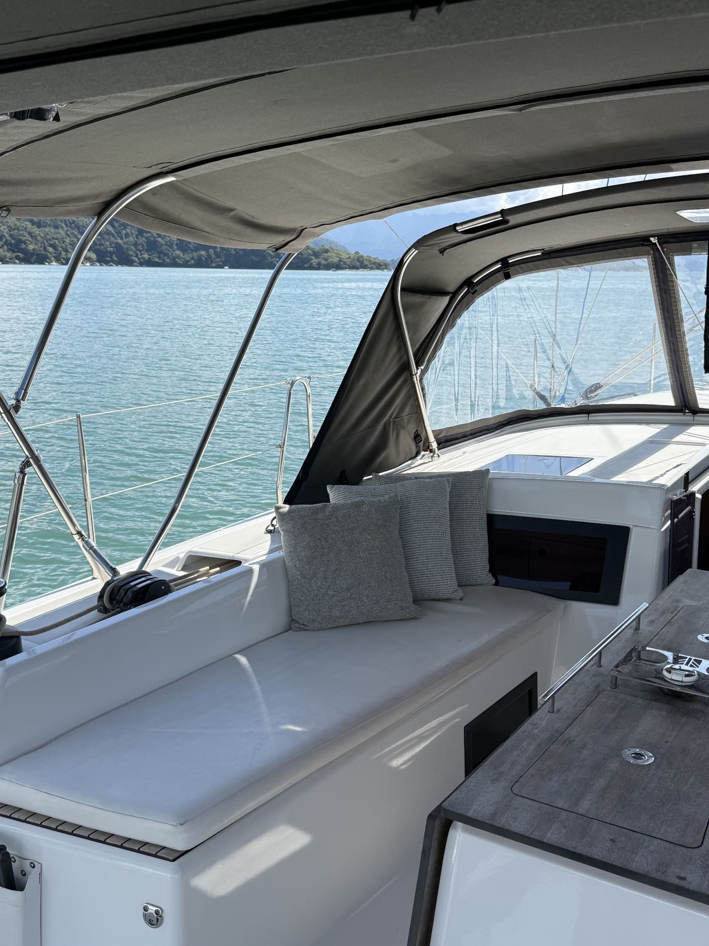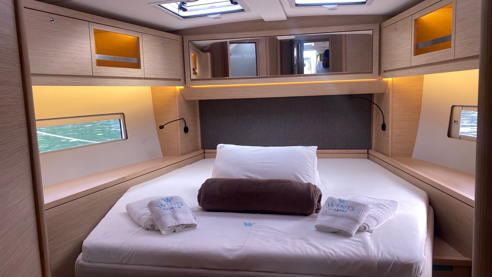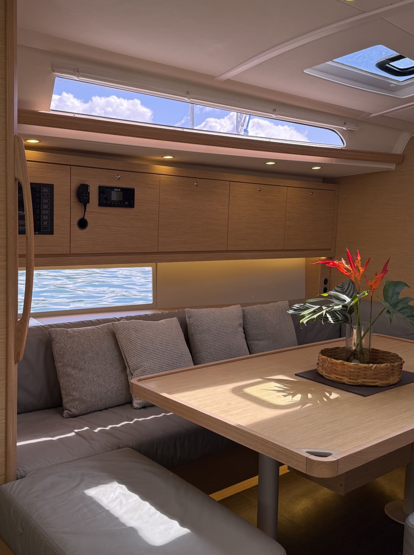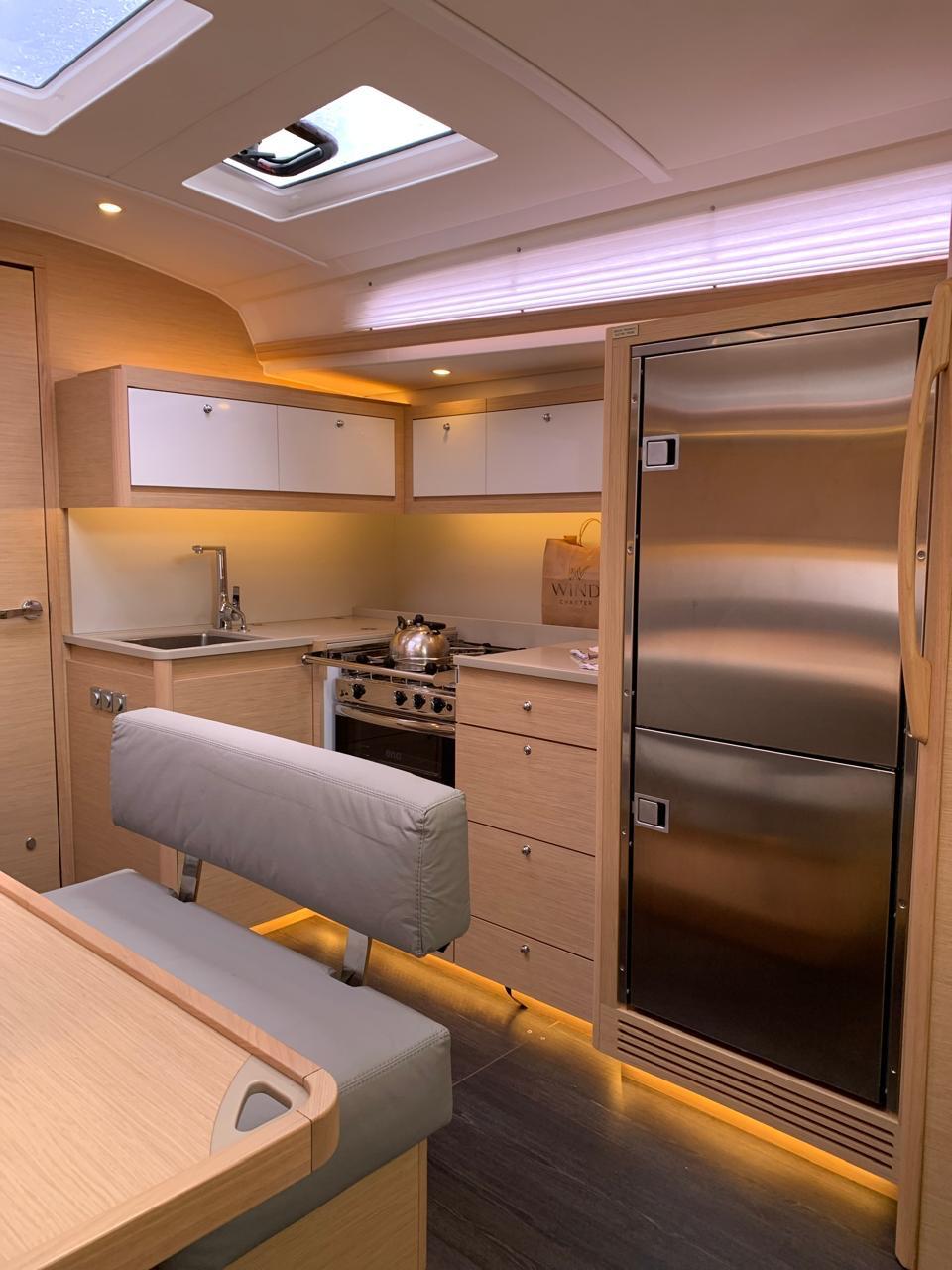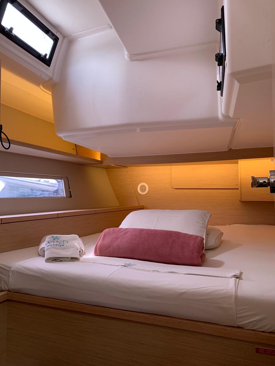 La distribución del Dufour 470 permite alojar a una tripulación de hasta 8 adultos + patrón, cómodamente alojados en 3 camarotes interiores y un camarote abatible (cabina lateral con dos literas individuales), además del tradicional y esencial camarote exterior para el patrón.